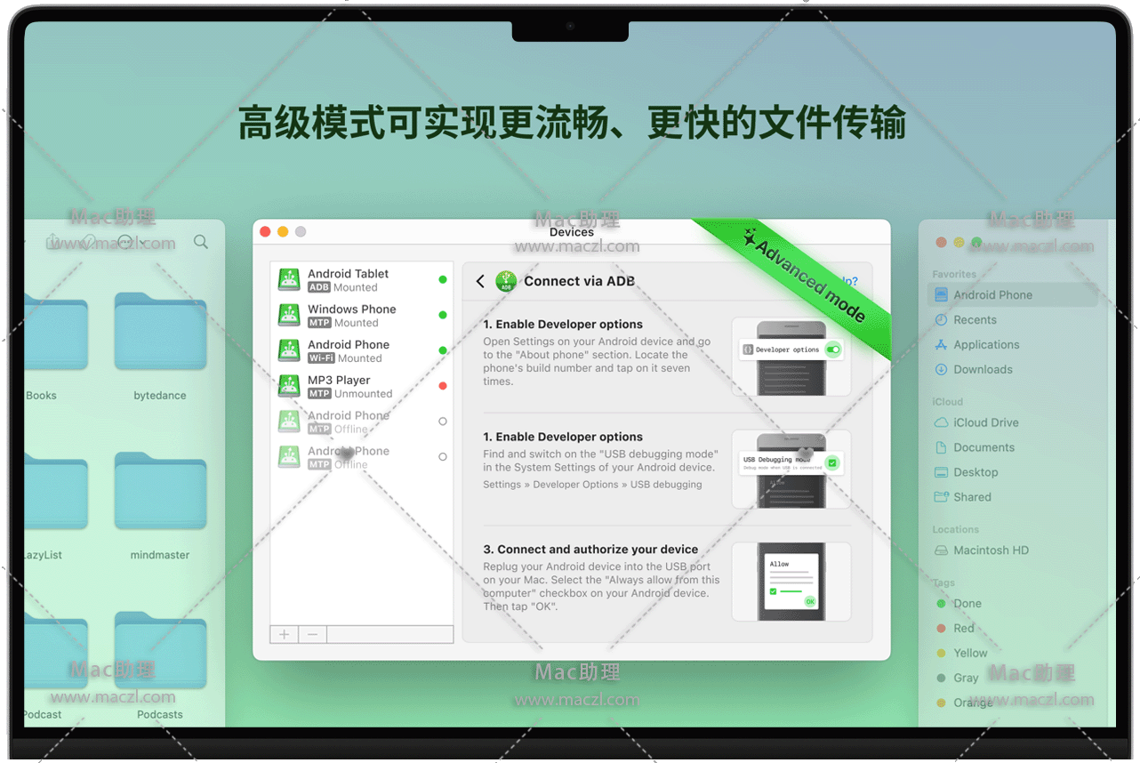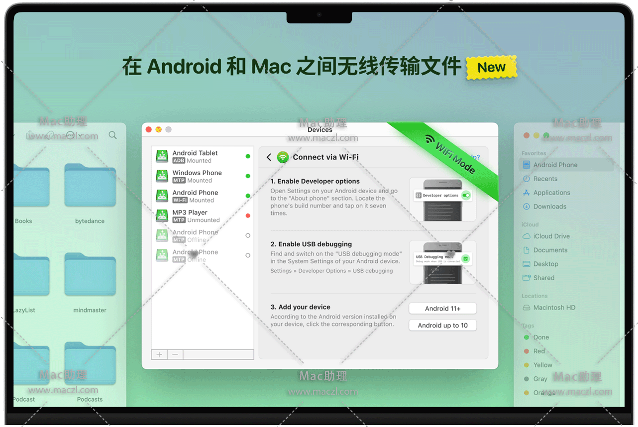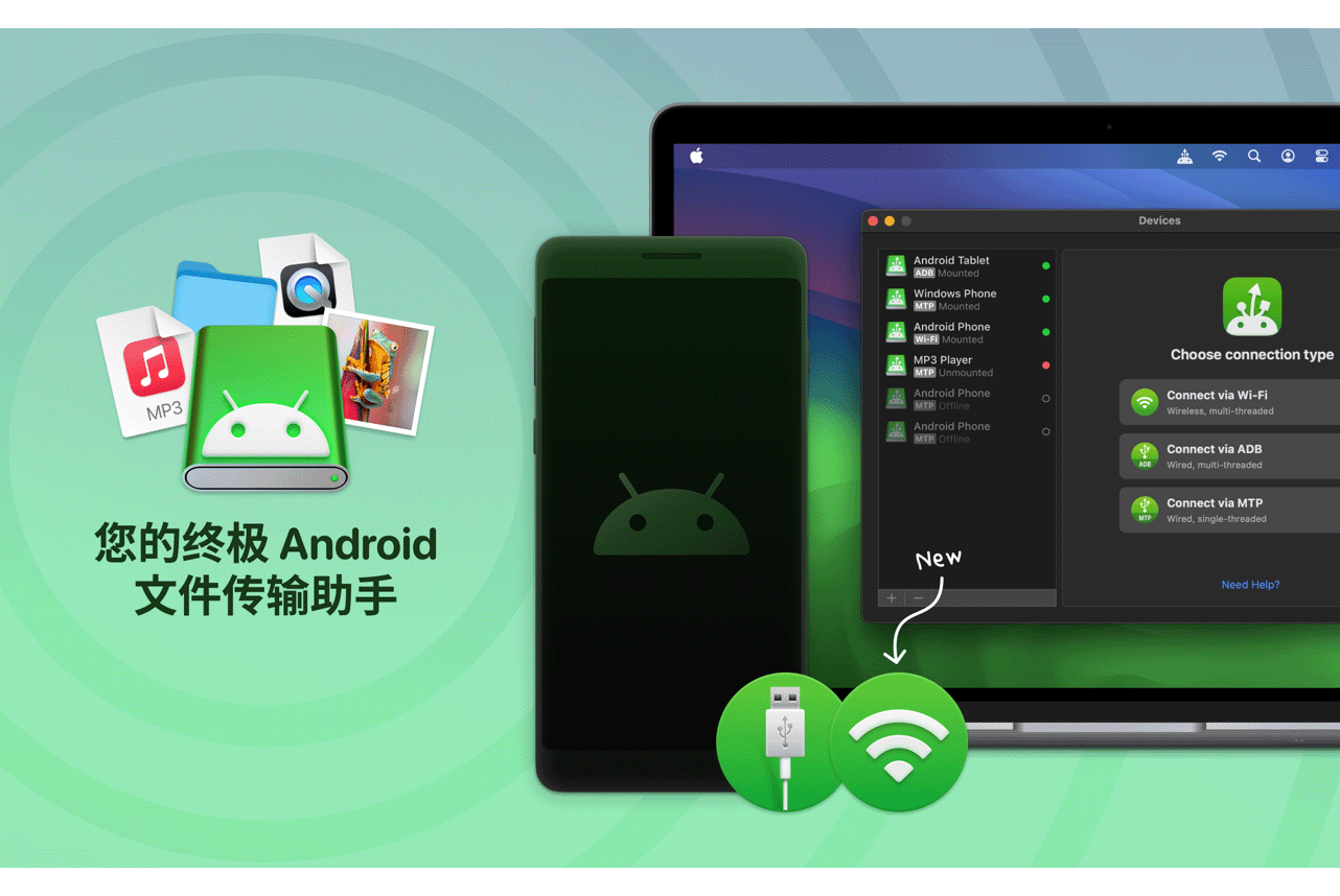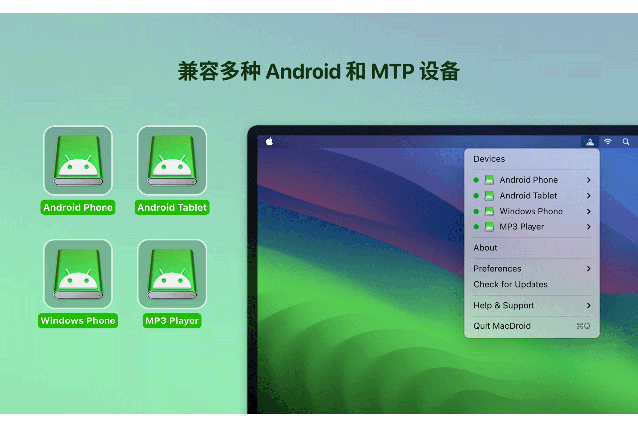 来体验一下 MacDroid 的终极兼容性吧。 该软件可以兼容安卓 4 以及更高版本的安卓系统,甚至MTP 设备。 是的,你没有听错!在使用该软件时,用户可以享受在不同设备之间传输文件的便利性,不仅仅是安卓设备和Mac设备之间,同样也可以与 MTP 设备进行文件传输。使用MacDroid 时,不需要在安卓设备上安装任何额外的软件。通过 Wi-Fi 或者 USB 线,轻松连接 Mac 电脑,并运行该程序。