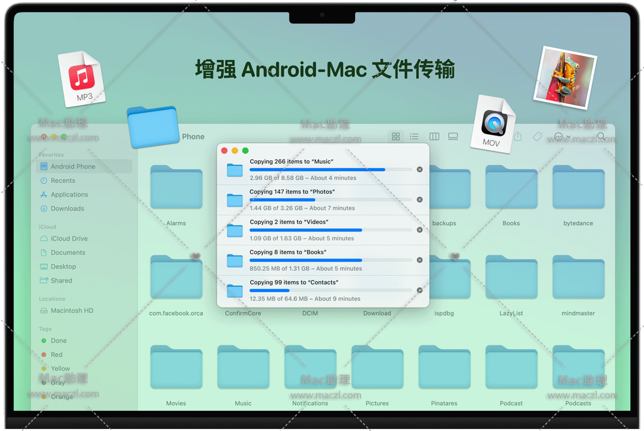 MacDroid - 安卓和 Mac 系统间传输文件的终极解决方案。这款软件能够在安卓设备任意文件夹之间无缝传输任意类型的文件。不管是图片、视频、音乐或者其它文件,这款 Mac 系统安卓文件管理器都可以胜任。