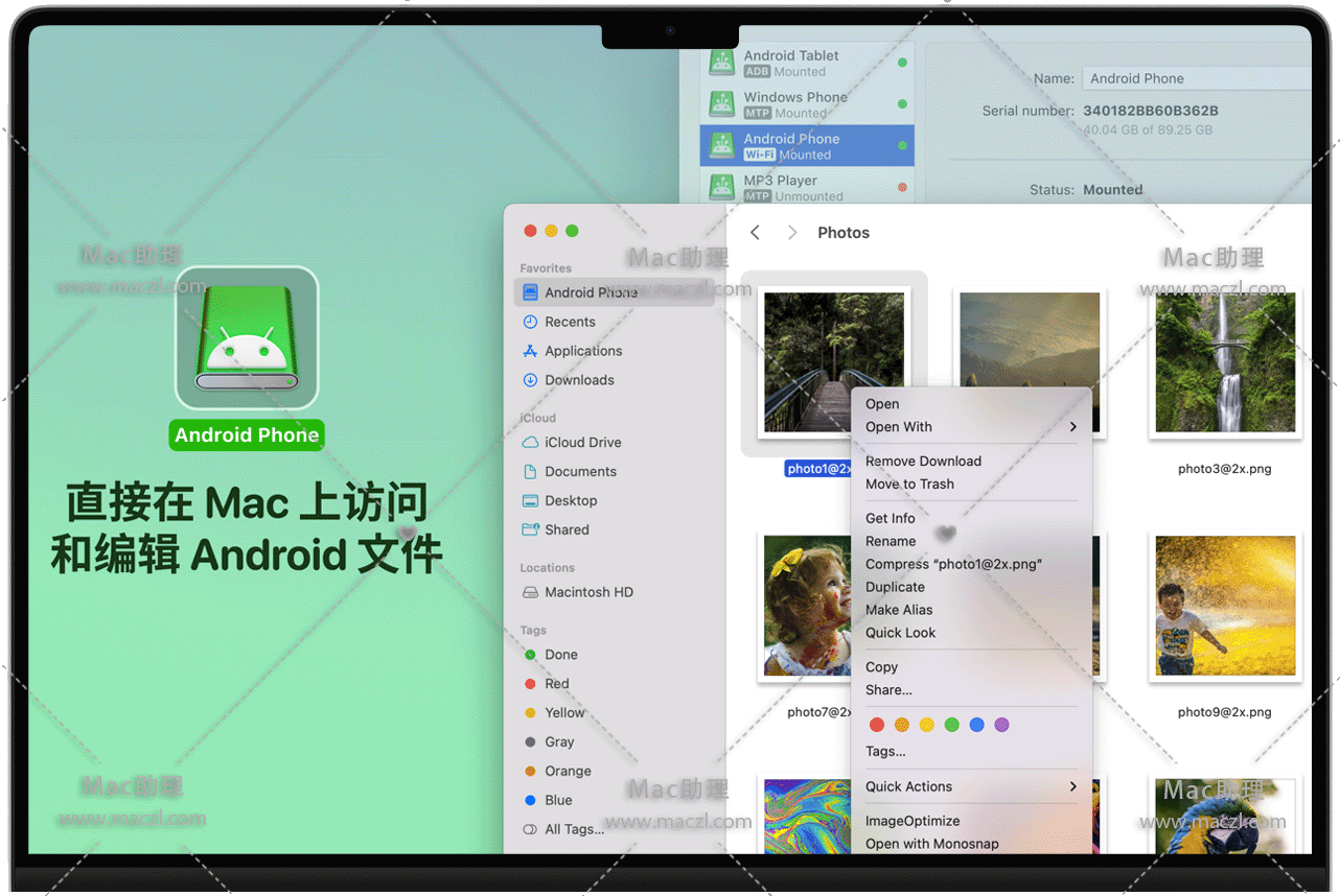 在 Finder 中访问您的 Android 文件,并在您最喜欢的 Mac 应用程序中对其进行更改,甚至无需将文件复制到 Mac。