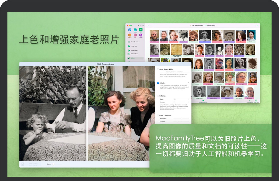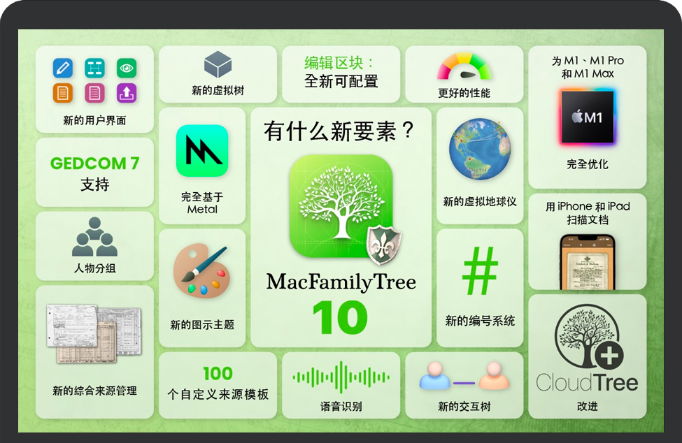 MacFamilyTree 10新功能全新的编辑区块 完全可定制,有更整洁的布局,更容易的数据输入,更快的导航和一个备选的编辑/查看模式——这只是我们实现的许多新功能中的一小部分。 新增:虚拟树 我们完全重新设计的虚拟树,让您可以一眼看遍所有的人及其相关人物。它更快,更有效,现在也显示了两个人之间的联系类型。 新增:来源管理 新的来源管理是一个大大增强的特性,它可以帮助您存储重要信息和支持条目的文档。通过使用可自定义的来源引用和我们预定义的模板,或创建自己的自定义模板,获得您的信息的完美概述。 改进:用户界面 我们改进的界面旨在提供卓越的用户体验,提供更好的概述和更快的导航——具有新鲜和现代的外观,闪电般的快速显示和无与伦比的用户友好性。 新增:虚拟地球仪 您在全球的家族史。我们已经修改了我们的虚拟地球,以更好的外观和改进功能。您可以选择性地显示特定时间内发生的地点或事件的图像。 新增:人物分组 创建尽可能多的群组(例如,所有来自柏林的人,所有来自米勒家族的人,所有您认识的亲戚),并在所有显示格式中通过颜色突出显示他们。 改进:交互树 刷新了外观和配色方案,大大提高了整体性能,更清晰地表示世代和连接。 改善性能 几乎所有的东西都要快得多:导航、编辑、创建报告、图示和3D显示。通过 CloudTree 的同步也大大加快了。 用 iPhone/iPad 扫描文档 这是一个难以置信的快速扫描文件的过程:通过“特殊”菜单拍照,导入,自动拉直,自动裁剪,您就完成了! ……还有很多! 新版本功能改进的图示/报告,包括新的样式和选项,个人和家庭事件的复制和粘贴功能,GEDCOM 7,一个新的启动窗口,和许多更令人兴奋的功能,我们知道您会喜欢!