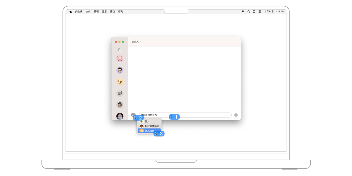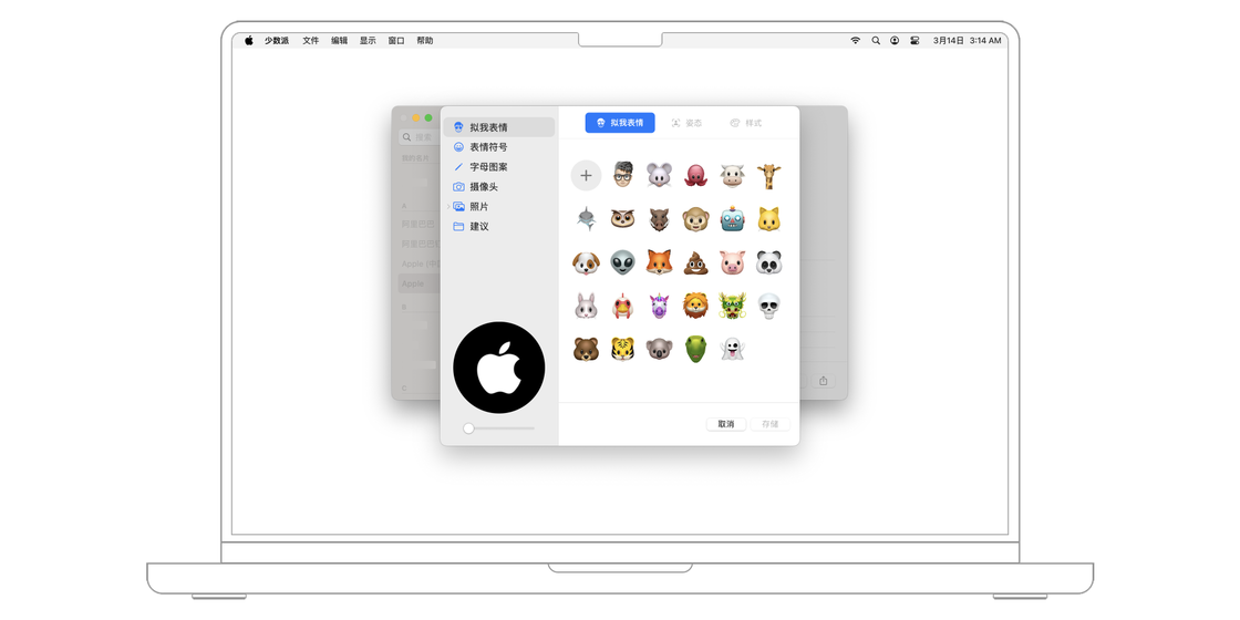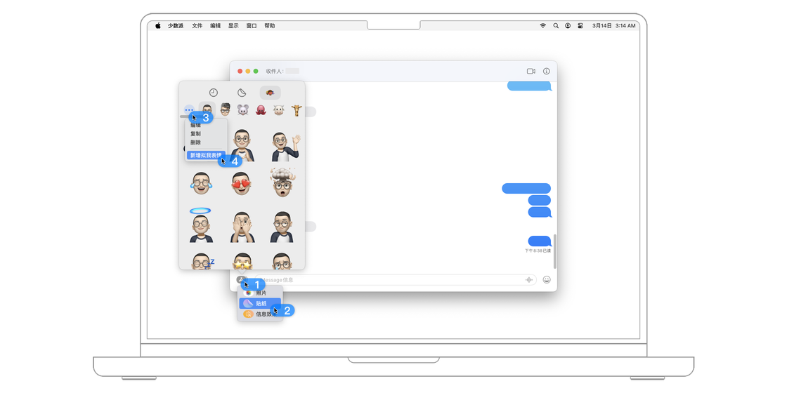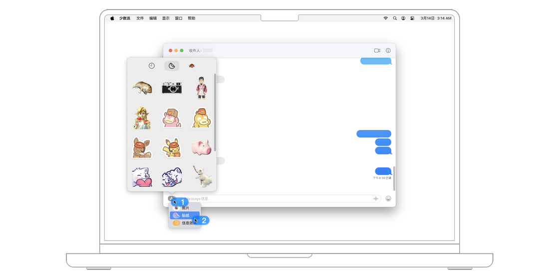 在输入框的左侧有一个 App Store 按钮,点击后选择「贴纸」就可使用该功能。在 macOS Sonoma 中,「贴纸」应用整合了实况贴纸和拟我表情。
