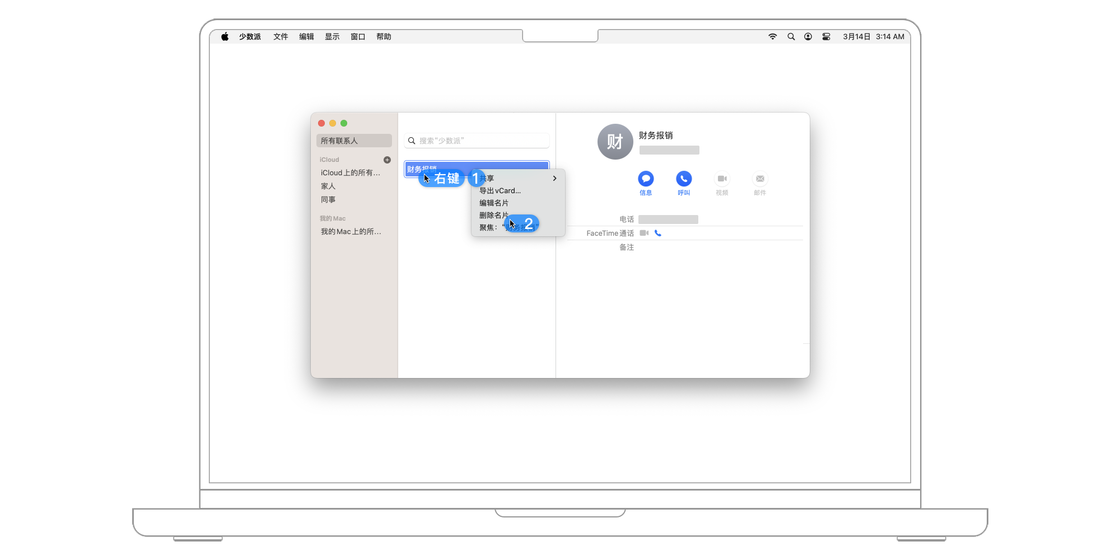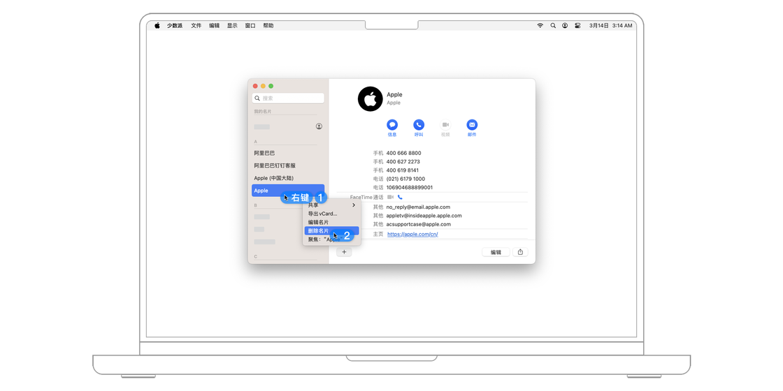 如果想删除一名联系人,在联系人页面点击右键,在菜单中选择「删除联系人」。