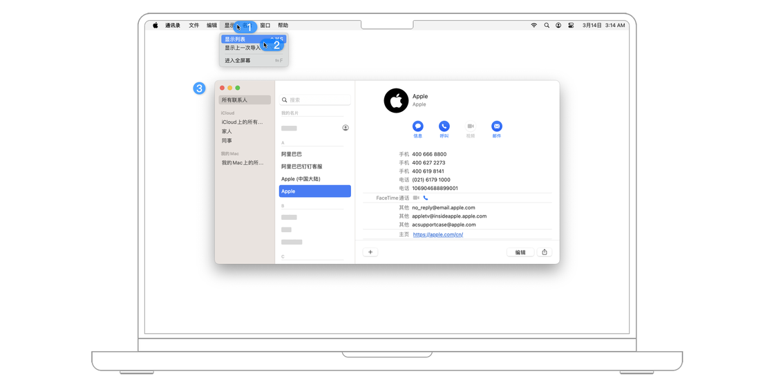 通讯录应用支持给联系人分组,以便更好地批量管理、也便于识别。打开 Mac 上的通讯录应用,在屏幕顶部的菜单栏选择「显示 > 显示列表」即可看到分组相关功能。