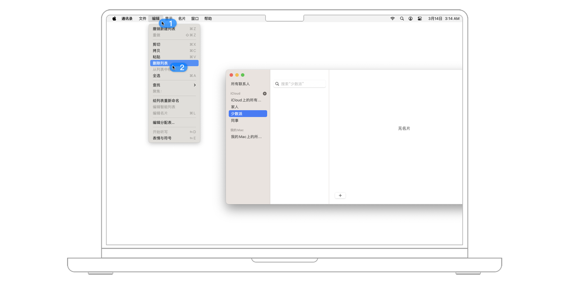 想要从群组中移除一位联系人,可以先从左侧边栏中选中该列表,然后右键点击想要移除的联系人,然后在菜单中选择「删除名片」,最后在弹出的窗口中选择「从列表中移除」。