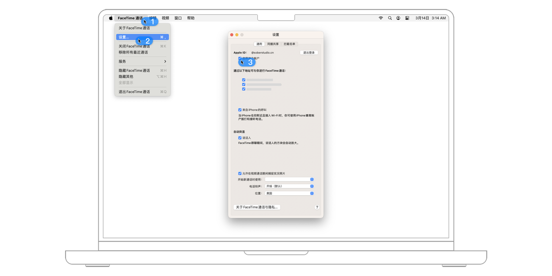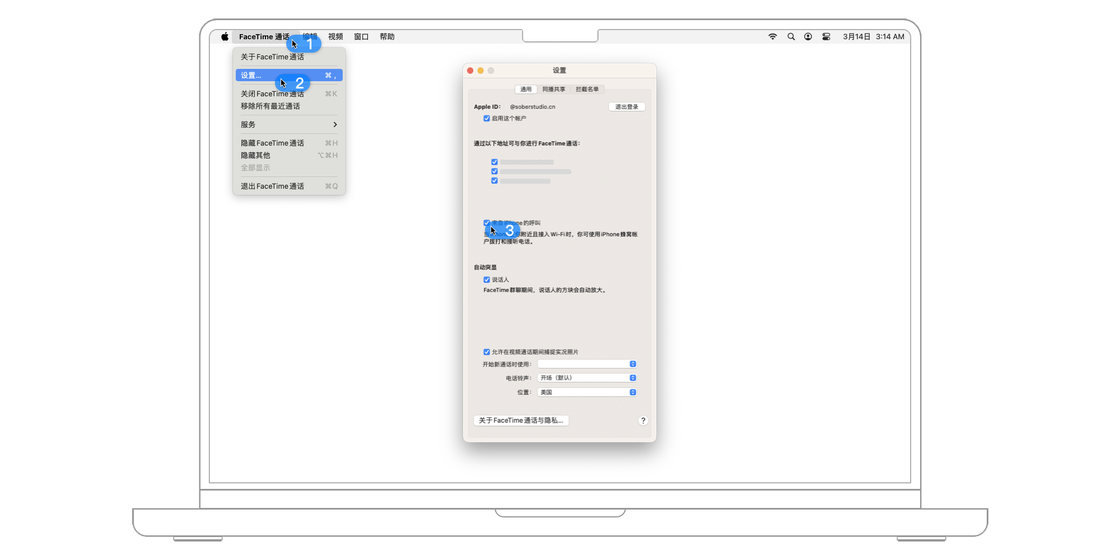 在用 FaceTime 通话之前,需要先打开 FaceTime 通话应用,然后在菜单栏前往「FaceTime 通话 > 设置...」,确保在设置界面的 Apple ID 下勾选「启用这个账户」。