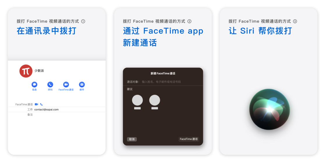 比如,在联系人卡片中(详见「通讯录」一节)轻点 FaceTime 通话按钮;也可以命令 Siri 直接用 FaceTime 呼叫某位联系人;还可以在 FaceTime 应用中发起 FaceTime 通话。