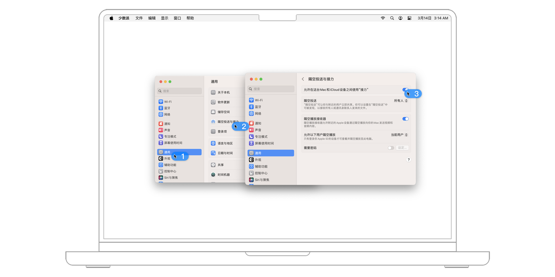 在「系统设置 > 通用 > 隔空投送与接力」中开启「允许在这台 Mac 和 iCloud 设备之间使用“接力”」选项后,你可将 FaceTime 通话从 Mac 顺畅地转移到 iPad 或 iPhone 上,当然反过来操作也没问题。同时,你已连接的 AirPods 耳机等蓝牙音频设备也会跟着切换到新设备上。