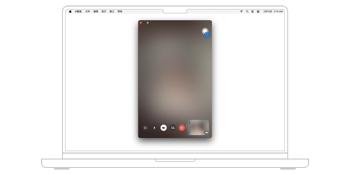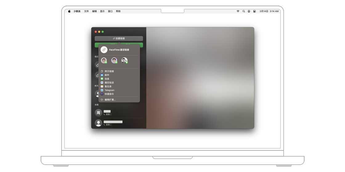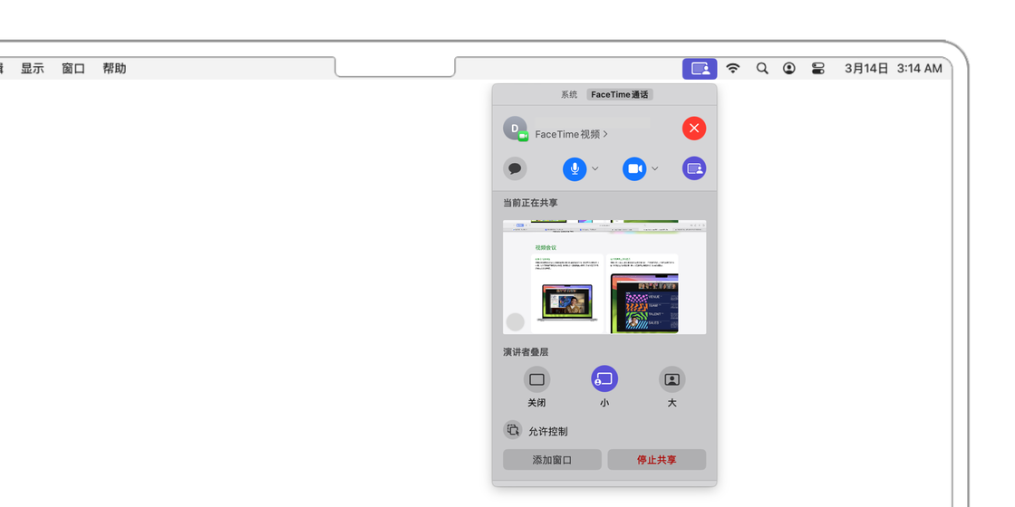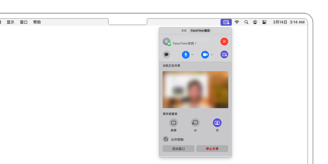 在通过 FaceTime 进行视频通话的过程中,我们还可以实时分享当前电脑上的任意窗口或者应用界面,可以帮助视频参与者更好地展示或者理解内容。