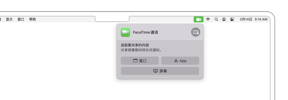 在拨打 FaceTime 通话时,可以在菜单栏进行详细的设置,选择在视频会议的同时分享 App、窗口或者屏幕。接通 FaceTime 视频通话后,也可以点击视频界面左下角的「共享」按钮进行选择。