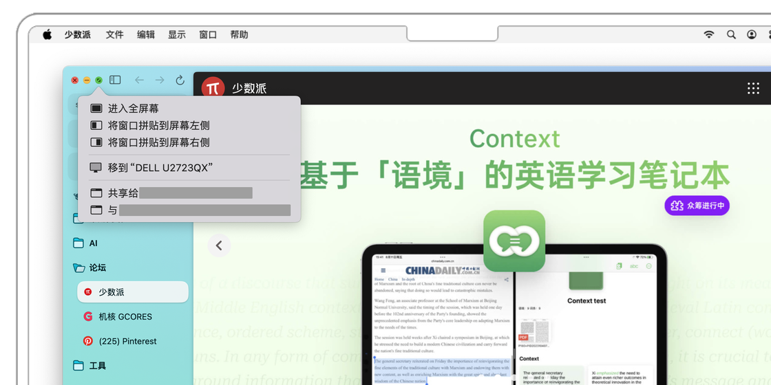 我们也可以在屏幕共享的过程中在当前窗口直接将一个或者多个 App 进行共享,操作方式也很简单,只需在想共享的窗口将鼠标光标停留在窗口左上角的绿色按钮,将可以在出现的悬浮菜单中选择共享窗口功能。