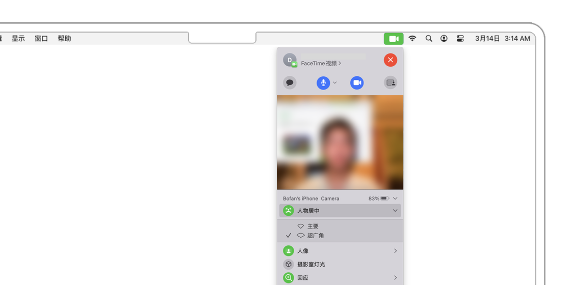 Center Stage 原本是 iPhone 和 iPad 上的功能,可以在视频通话时保持人像在画面中央。在 macOS Sonoma 上,我们可以通过连续互通功能来将 iPhone 作为摄像头,同时也可以用上 Center Stage 功能,始终将自己的头像保持在画面的中央。在菜单栏中,我们还可以选择使用 Center Stage 功能时启用 iPhone 的广角镜头还是超广角镜头。