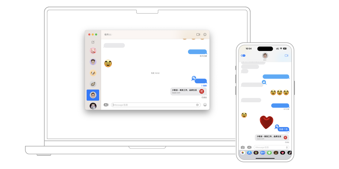 除了发送文字和图片外,iMessage 信息中还可以发送各种类型的媒体、文件等信息,这不仅包括语音、图片,还包括贴画、拟我表情和第三方应用提供的交互功能。
