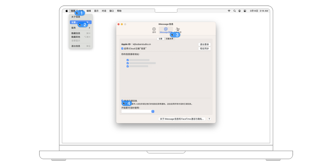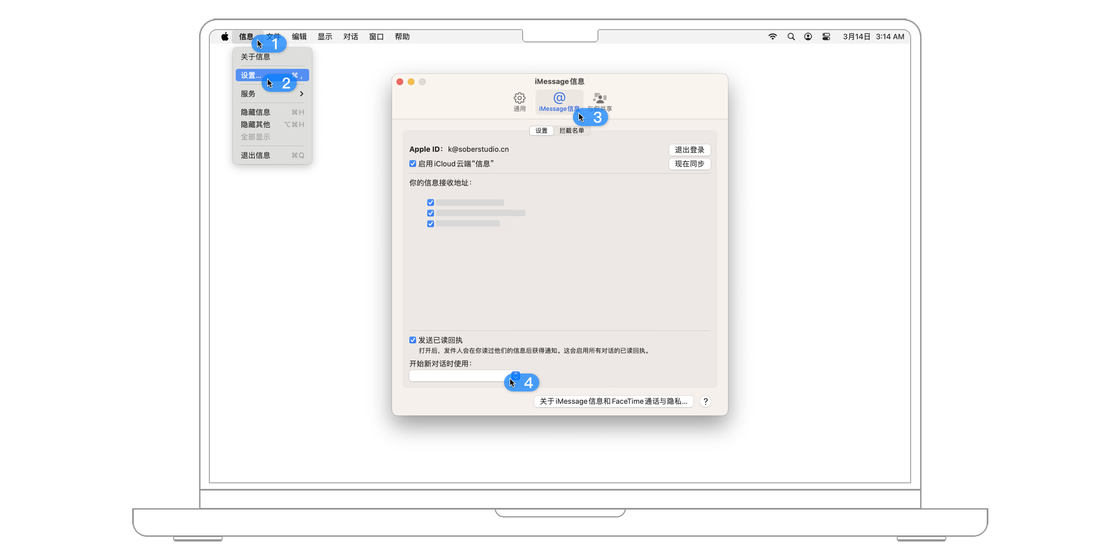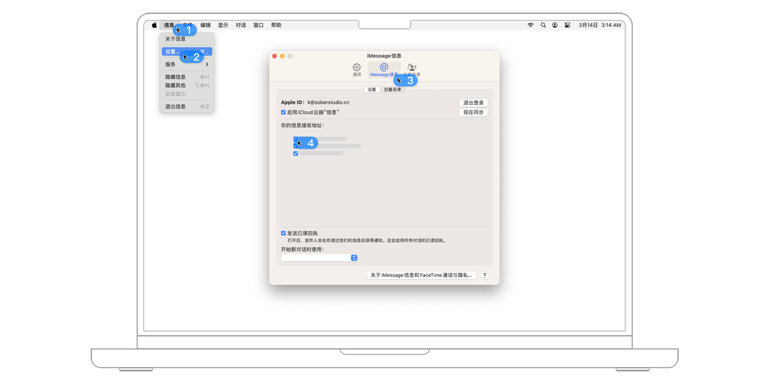 Mac 上信息应用中可选的 iMessage 收发地址有三个: