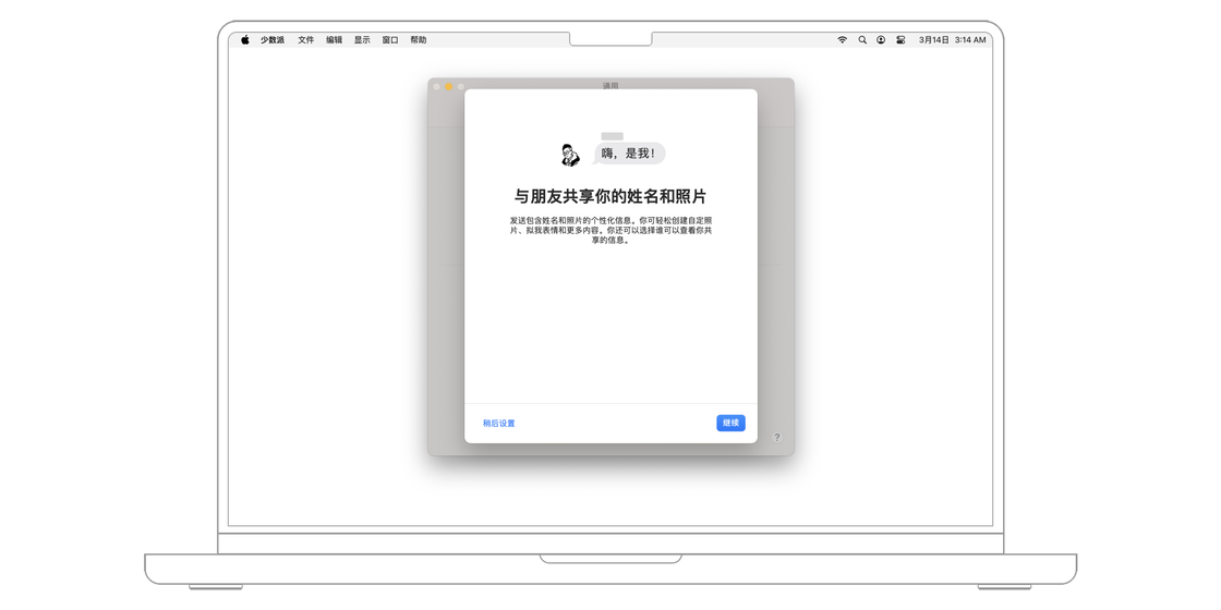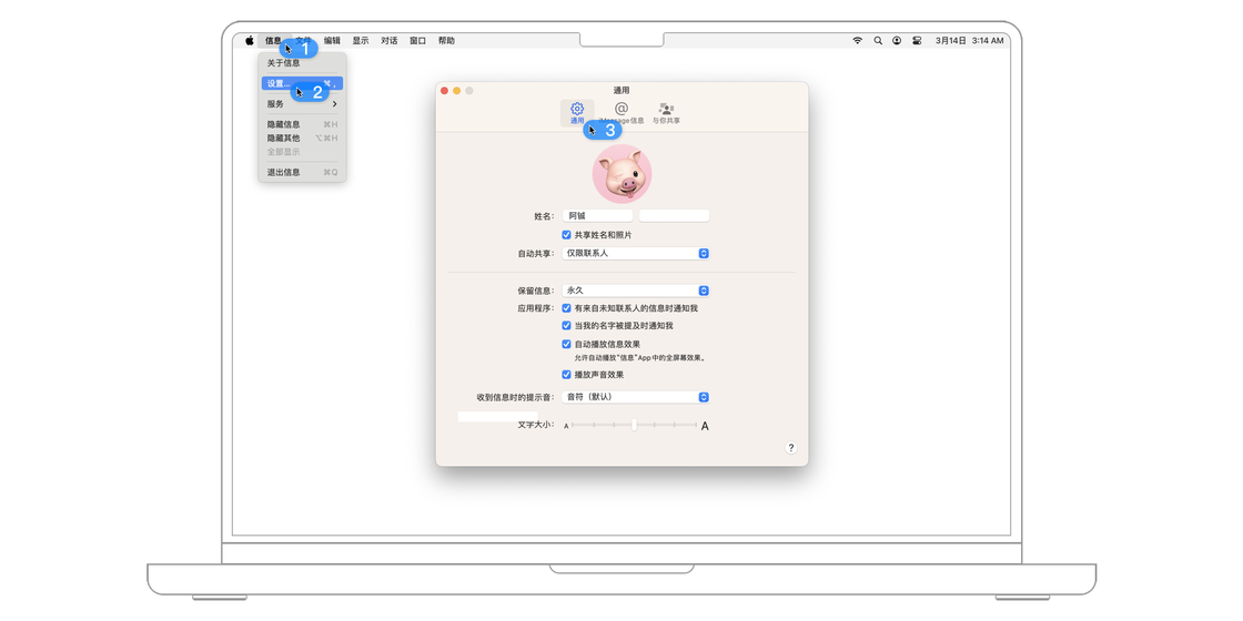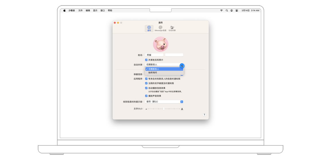 作为即时通讯工具,iMessage 中当然可以设置昵称和头像(称为姓名和照片)。想要设置这两个项目,在菜单栏前往「信息 > 设置... 」,然后在通用设置页面就可以看到头像和姓名的设置按钮了。