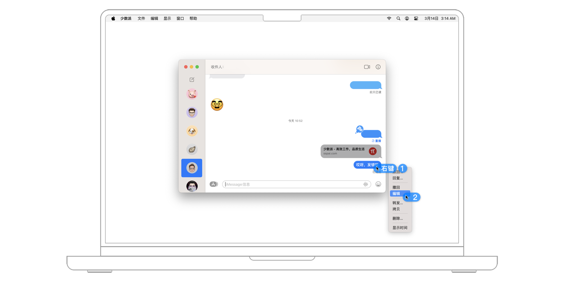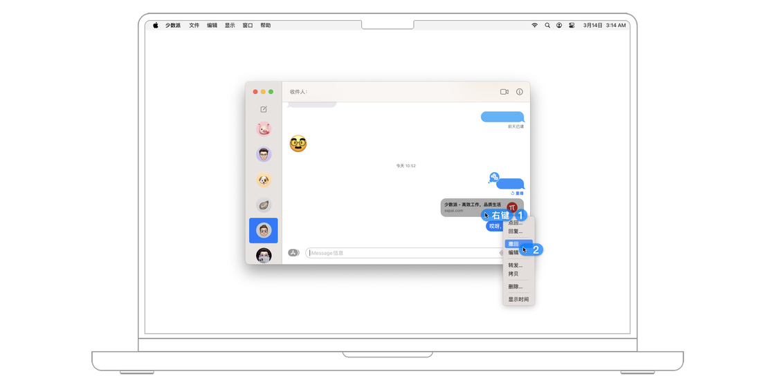 如果不小心发送了错误的信息,或者发错了人,那么你可以将该条信息撤回或者进行编辑。在更新到 macOS 13 后,你可以在发送一条信息后的两分钟内通过鼠标右键点击,然后在菜单中选择「撤回」来完成撤回操作。