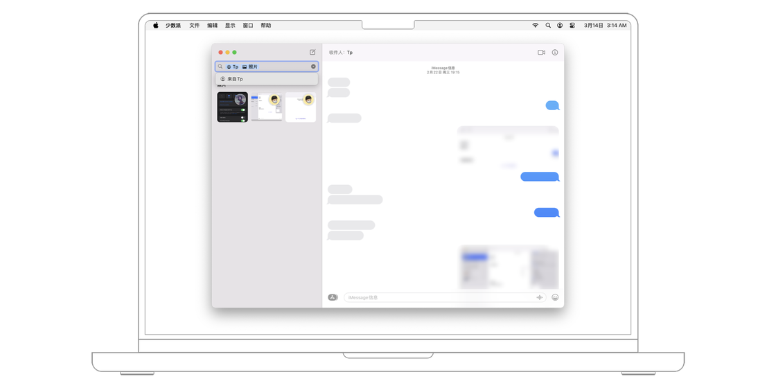 在左侧联系人列表的顶端有一个搜索栏,在此处我们可以通过关键词来搜索信息。在 macOS Sonoma 中,苹果为信息搜索加入了筛选功能,可以使用不同的筛选条件来配合关键词来更加快速和准确地定位信息。