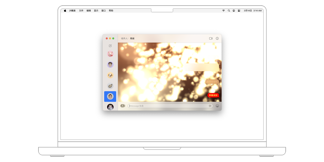 除了手动为信息添加效果,当发送某些特殊语句时会自动触发全屏效果,比如发送「恭喜发财」会触发「欢庆」效果。