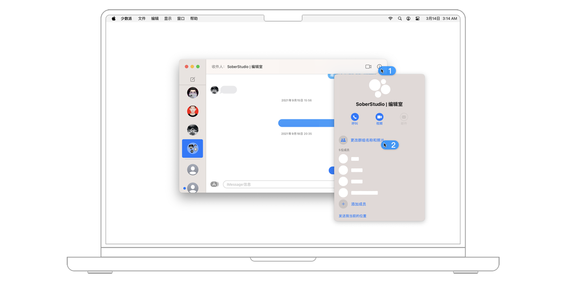 在创建 iMessage 对话时选取多名联系人,就可以创建一个 iMessage 聊天群组。通讯录中保存的联系人姓名和头像将出现在对话中。