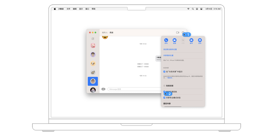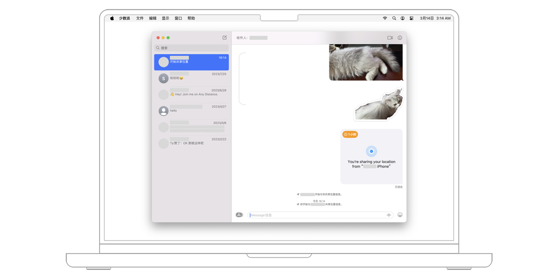 在 macOS Sonoma 中,我们还可以通过信息 app 来与好友们分享自己的实时定位。使用方式很简单,在当前聊天窗口点击右上角的「i」按钮,然后选择「共享我的位置」,系统会出现一小时、至今天结束和始终三个选项,选择后可以将分享链接发送给对方。