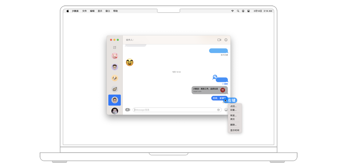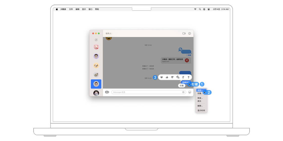 其中,「右键菜单 > 点回」或在消息气泡上用力按压触控板,可以从里面直接选取一个表情作为对消息的简短回应,比如爱心、点赞、踩、哈哈、感叹号、问好等。