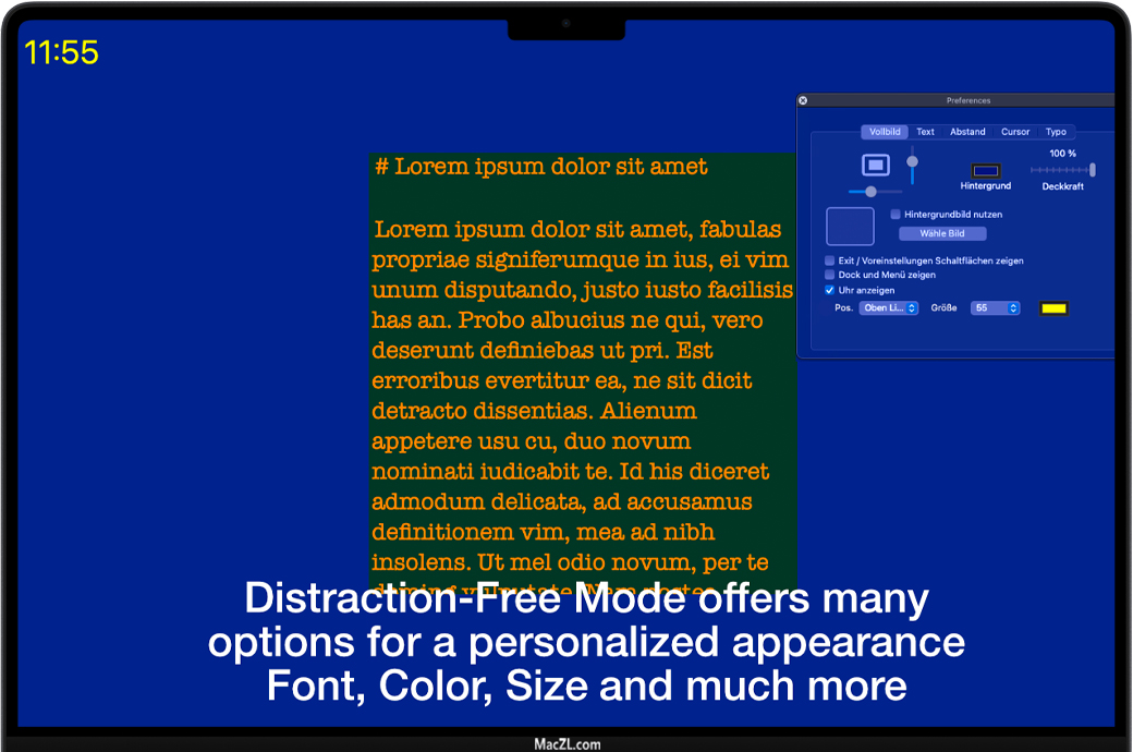无干扰模式隐藏了所有元素,从而将注意力完全集中在实际文本上。与普通编辑器一样,在无干扰模式下有几个自定义选项。