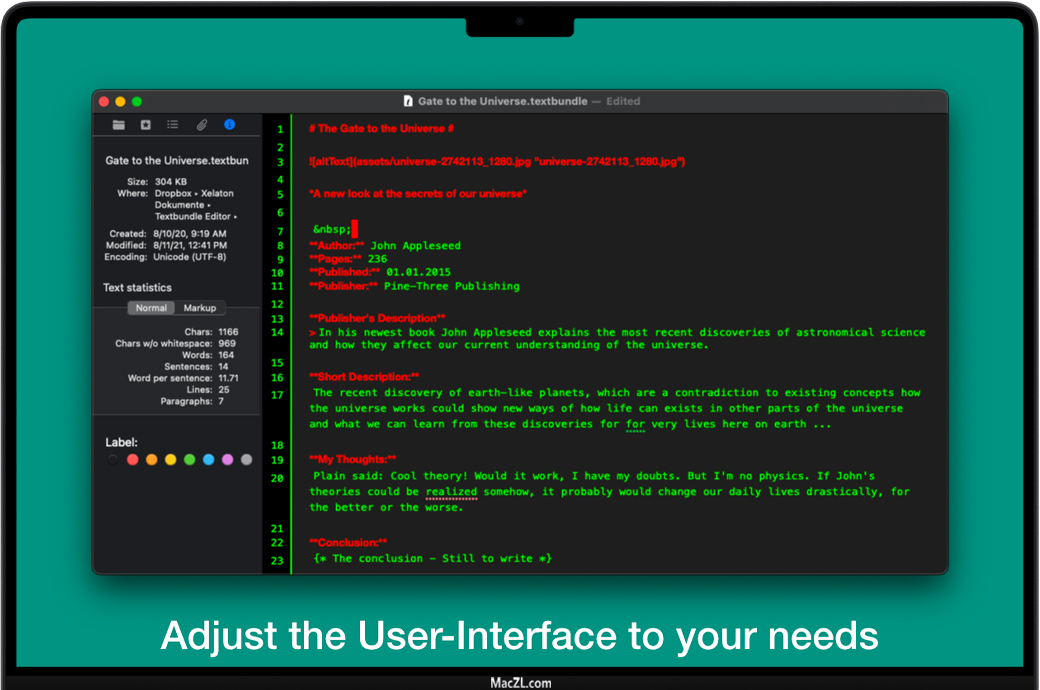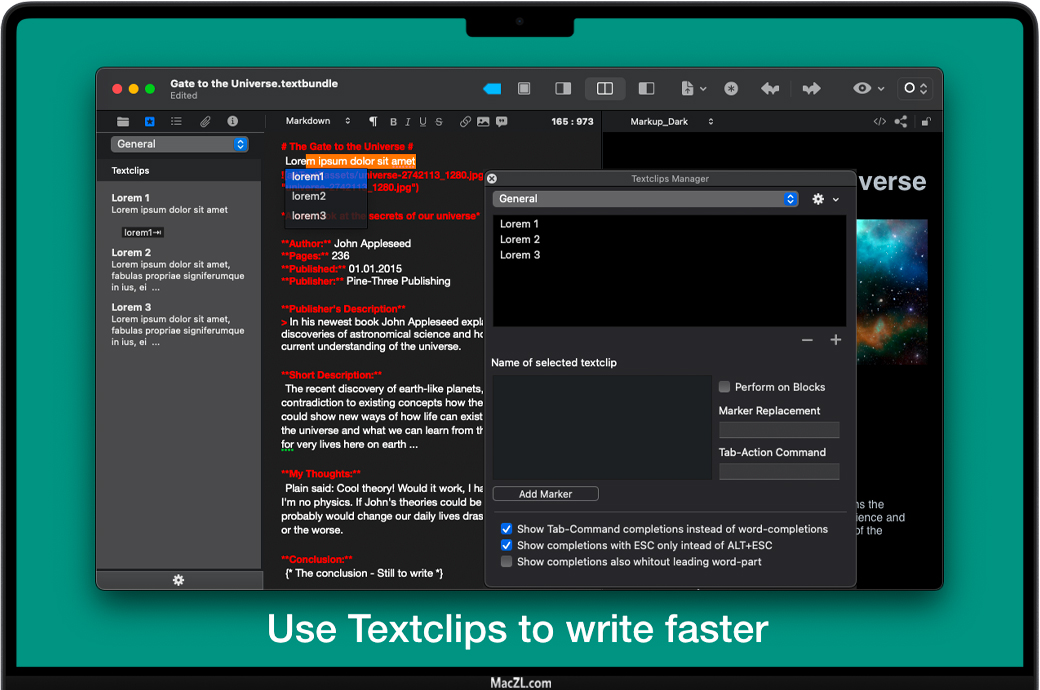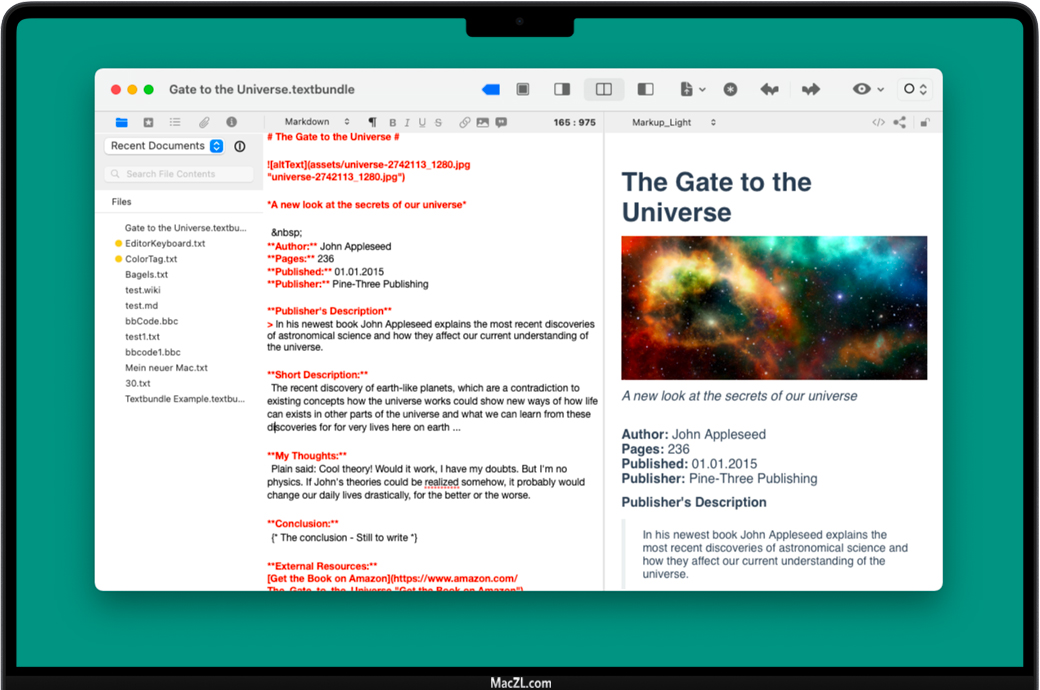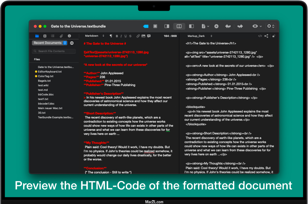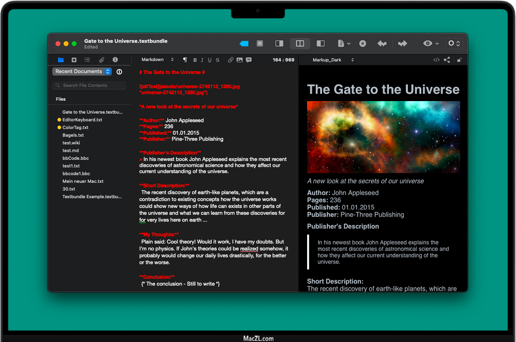 MarkMyWords for Mac 是一个全面的写作环境,适用于所有使用标记格式创建文本的人。支持:Markdown+Extra,MultiMarkdown,Textile,Wikitext,BBCode,HTML等众多格式。