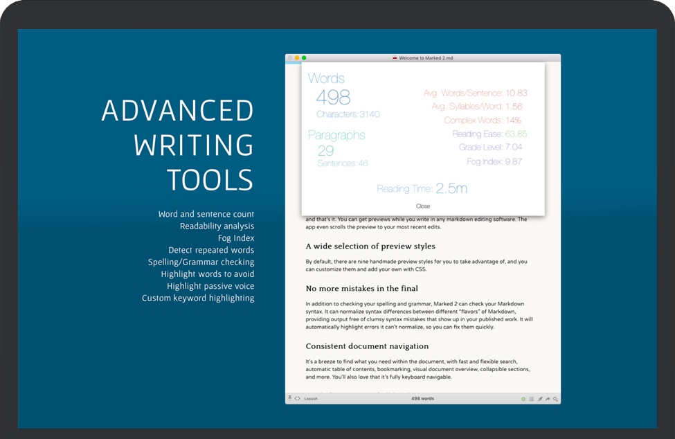 Marked包含大量书写工具。检查您的字数,查看您在哪些地方使用了过多的单词,在哪些地方可以简化和加强句子,并通过一个应用程序检查拼写和语法。想知道你是否在打你的观众?检查年级分数和阅读时间计算,在您写作时自动更新。