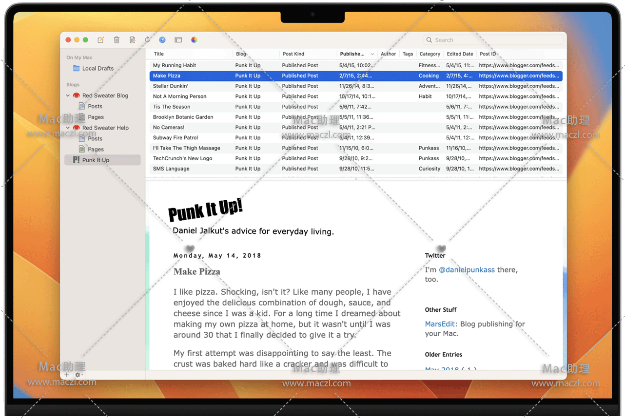 对于大多数博客服务,MarsEdit 可以下载已发布文章和页面的完整历史记录,因此您的所有写作内容都会备份到您的 Mac 上。