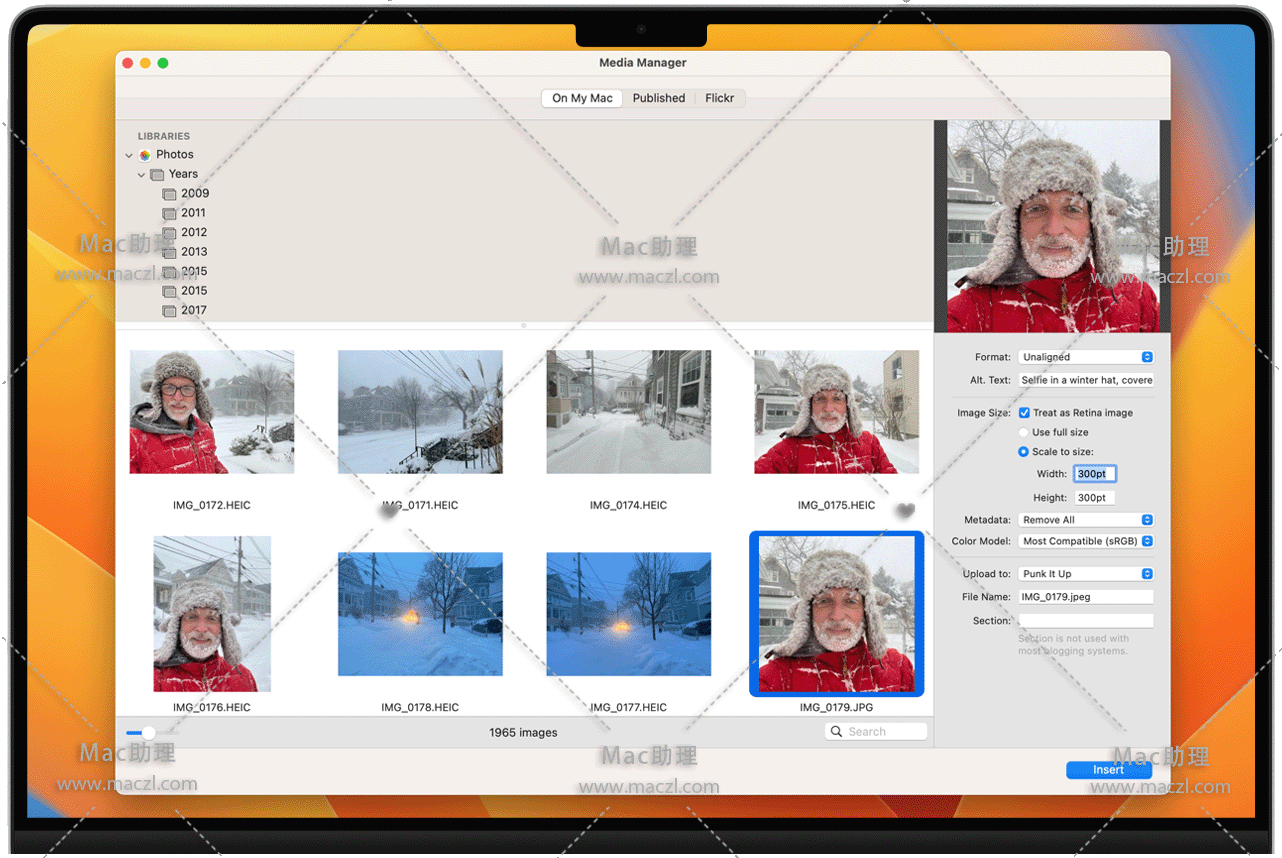 浏览您的 Apple 照片,直接拖拽图片,或点击按钮将图片插入到博客文章中。MarsEdit 会在您准备发布时自动上传所有图片。
