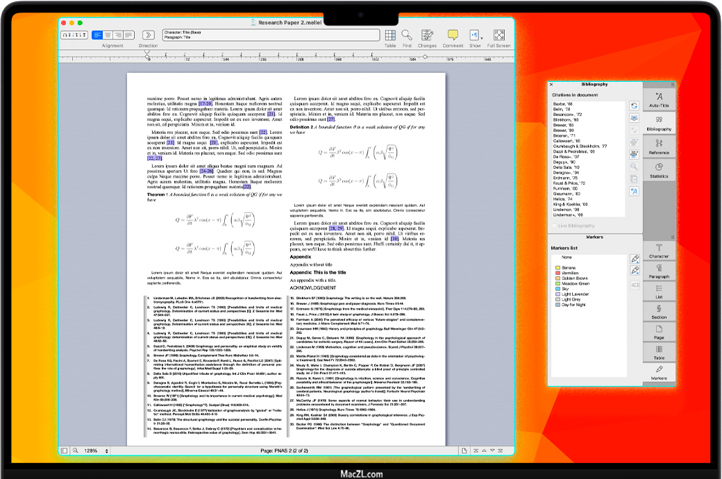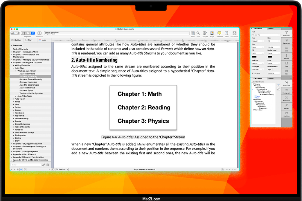 Mellel 6 for Mac 是一款强大的文字处理工具,它可以处理所有较长篇幅的书面作品,无论是论文,手稿还是小说。Mellel为您提供了编写过程各个方面所需的控制权:大纲,脚注,参考书目,样式等。从最初的想法到最终的手稿,Mellel使您可以在整个过程中使用一个可靠的工具:您所要做的就是编写它。