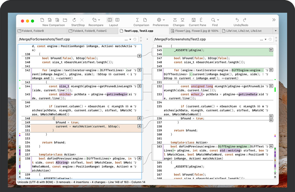 Araxis Merge Pro for Mac 是一款支持两路和三路可视文件比较/合并和文件夹同步应用程序。使用它来比较、理解和组合不同版本的源代码、网页和其他文本文件,甚至是从另一个应用程序(例如,Pages或Microsoft Word)复制和粘贴的文本。Araxis Merge与Time Machine集成,因此您可以比较旧版本的文件。