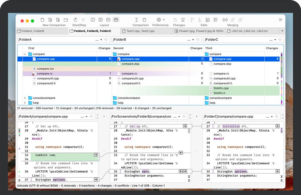 Merge 支持文件夹层次结构比较和同步,使您能够比较和合并整个目录树。这非常适合检测不同版本的源代码或网页中的更改。您甚至可以使用高效的逐字节比较选项来验证可刻录 CD 或 USB 拇指棒的内容。