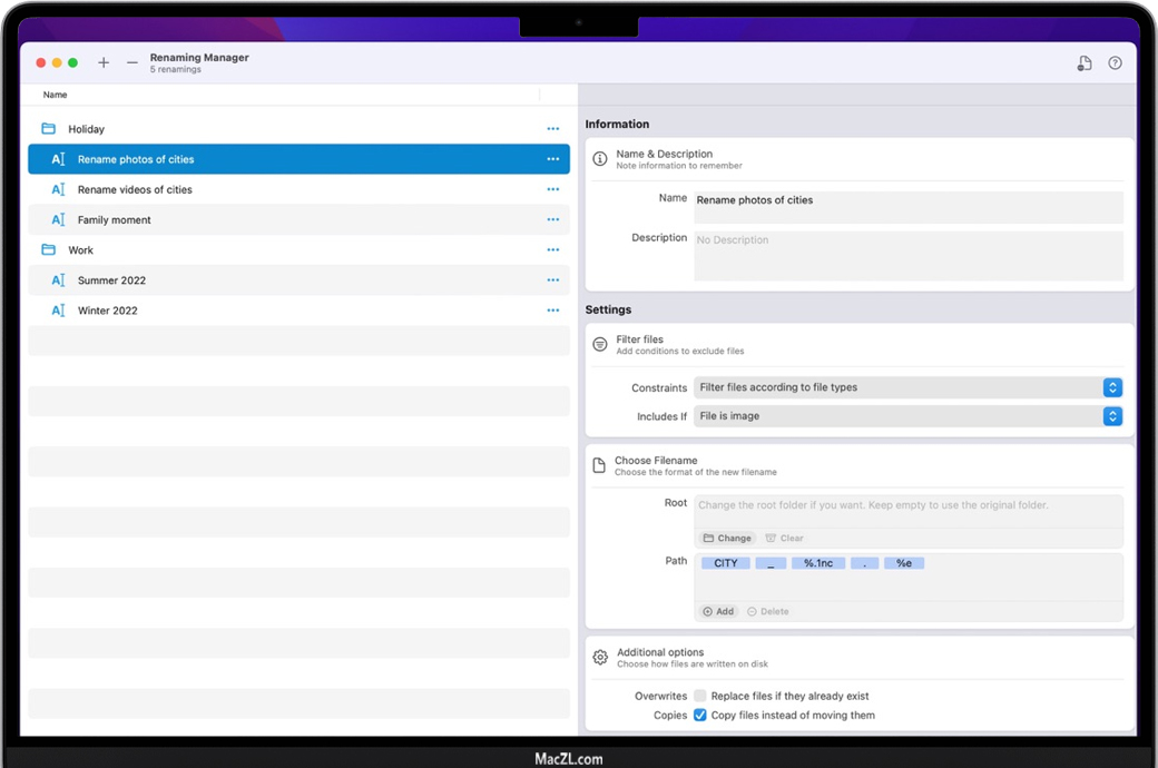 MetaRename for Mac 是需要定期管理大量文件的摄影师和摄像师的首选工具。 通过使用 MetaRename,您可以根据相机型号、拍摄日期和位置等元数据轻松重命名和整理您的照片和视频,让您在需要时轻松找到所需的文件。