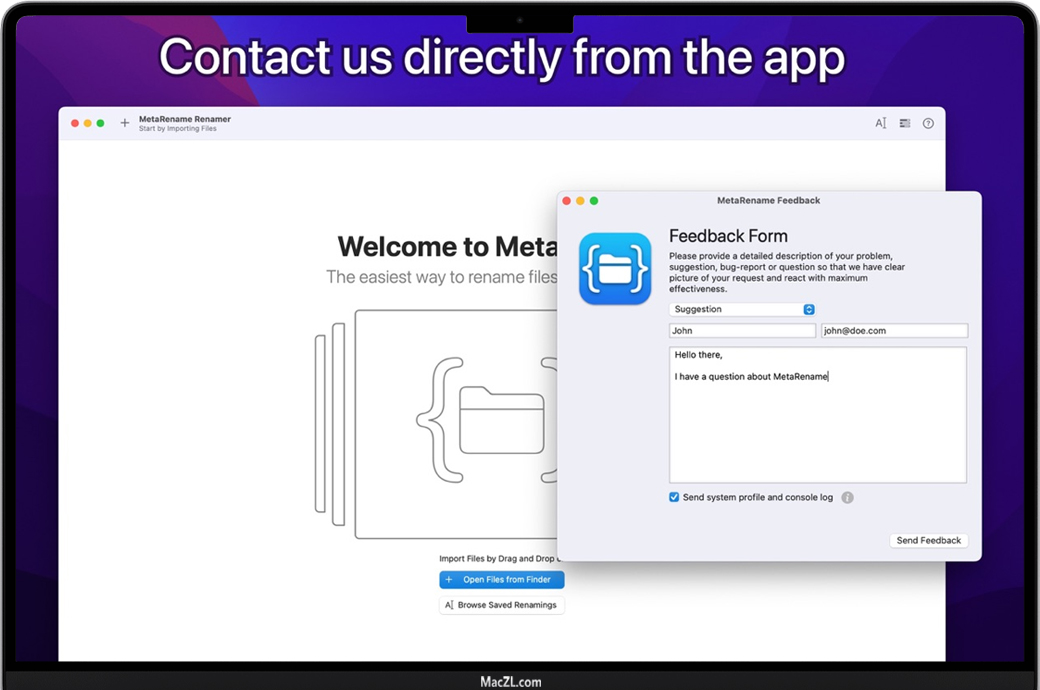 使用 MetaRename,用户可以通过应用程序的内置反馈窗口联系支持团队。 通过单击“反馈”按钮可以很容易地向团队发送消息。 我们随时可以帮助解决任何问题或疑虑,并致力于提供出色的客户支持。