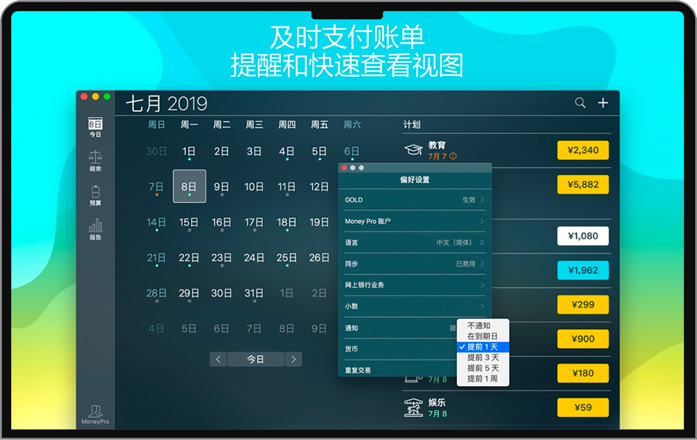 Money Pro 可以预测当天未手动安排的交易
