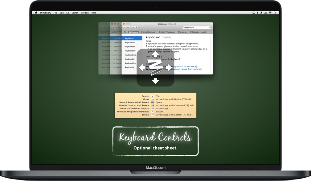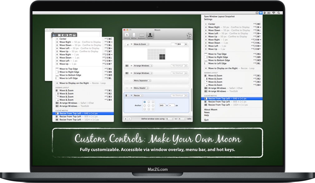 键盘用户,请放心,Moom不仅适用于喜欢使用鼠标的用户。启用键盘控制,您就可以移动,调整大小,居中,使用屏幕上的网格等等,所有这些都无需触摸鼠标。