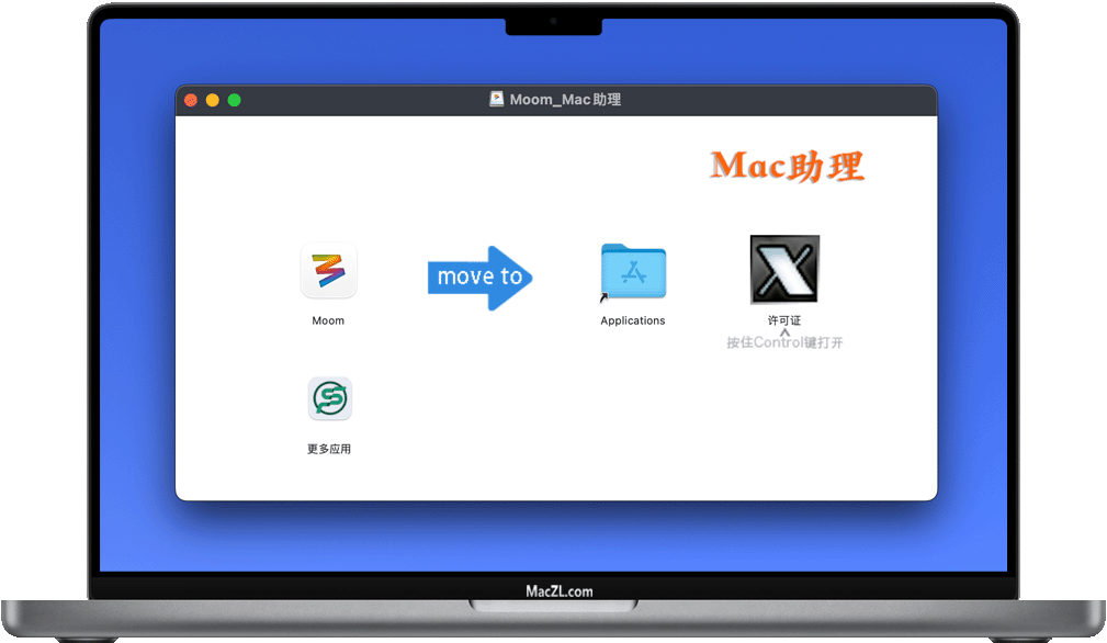 软件下载完成后,打开软件包如上图,将左边的【Moom】软件拖动到中间的 Applications 文件夹进行安装。
