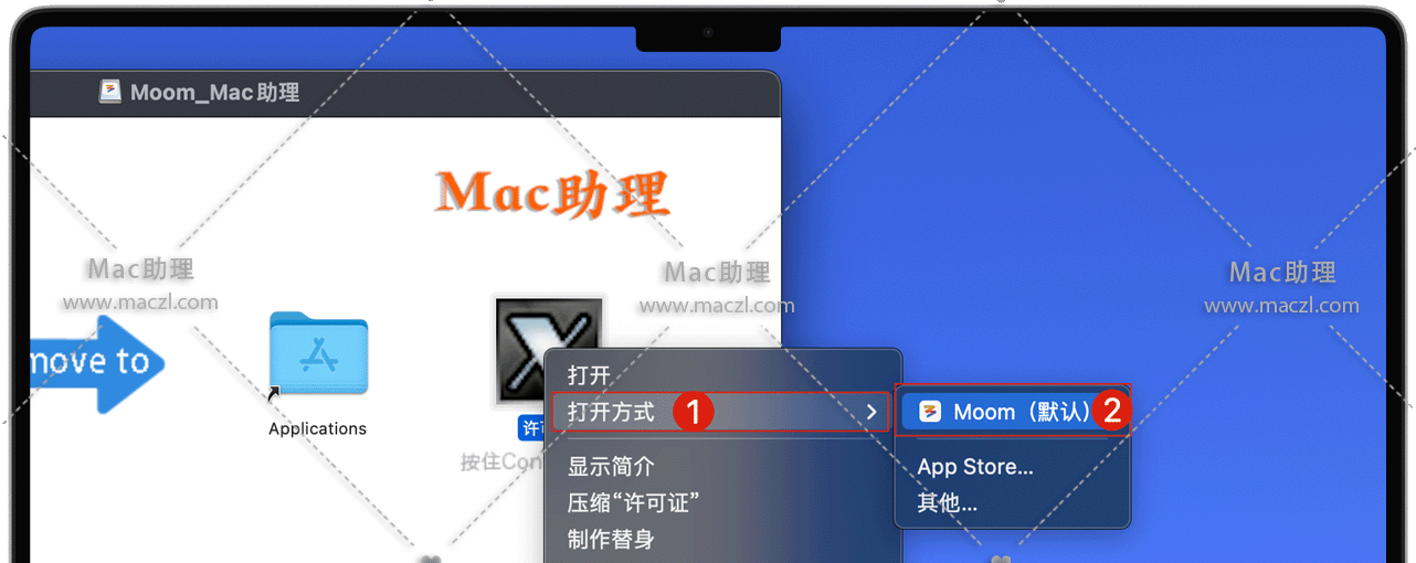 安装完成后,鼠标选中右边的许可证【许可证】文件并右键,然后选择“打开方式”→ “Moom(默认)”打开即可。