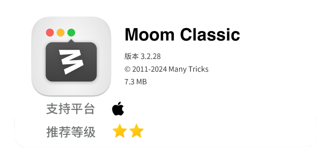 首先你得注意到这款软件的名称是 Moom Classic:现在官网最新的是 Moom 4 了,而 Moom 3 改名 Moom Classic 仅在 App Store(Mac)和Mac助理提供下载。