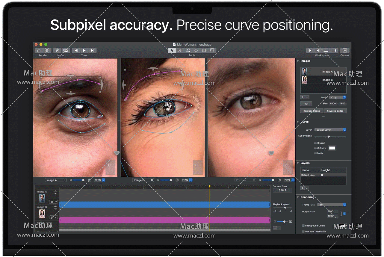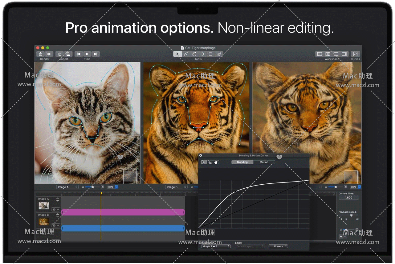 Morph Age for Mac 是一款macOS上创建变形和扭曲动画应用程序。使用“Morph Age”,可以从两个或多个图像创建变形动画。定义每个图像中匹配特征的曲线(例如,在面部变形的情况下,眼睛、鼻子、嘴巴的轮廓),并实时预览更改。如果对结果满意,可以将变形导出为电影或多个图像。可能性几乎是无限的!变形人脸,动物,人对动物,物体…