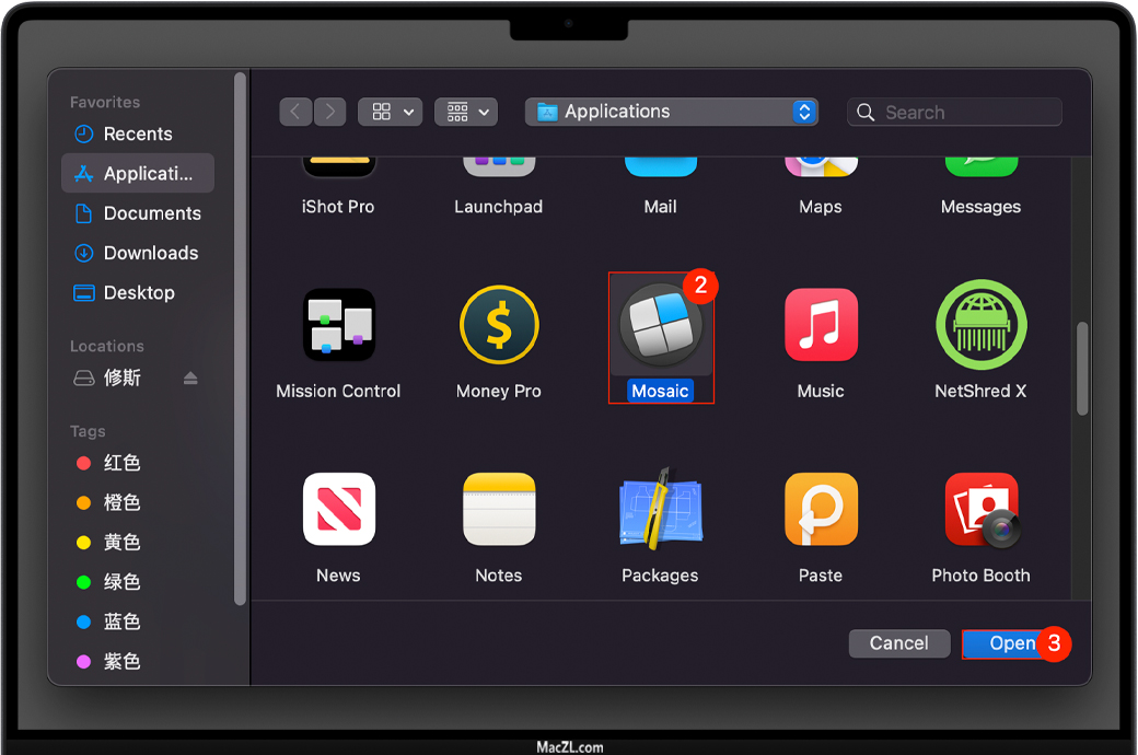 4. 然后跳转到Mac应用程序里面,选择需要注册的“Mosaic”软件之后点击“Open”按钮返回注册机界面。
