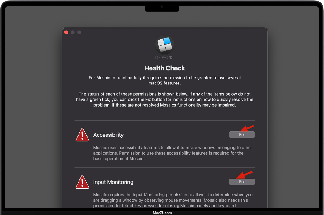 6. 首次运行Mosaic时需要给辅助功能输入监听、和屏幕录制的权限,如下图,点击“Fix”即可跳转到对应权限的具体位置,然后找到Mosaic并且将其选中即可。