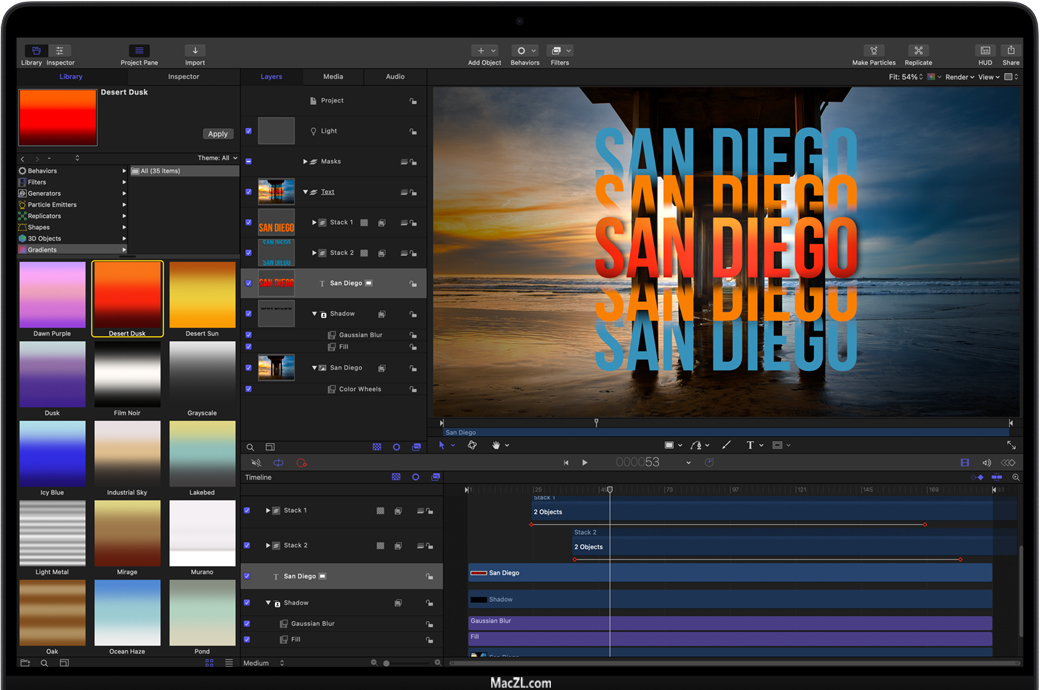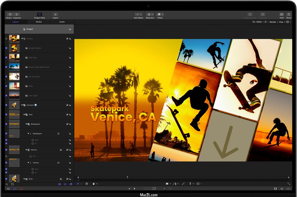 用 Motion 来为 Final Cut Pro 项目制作字幕、转场、发生器、滤镜等再理想不过。在 Motion 中保存的特效可立即在 Final Cut Pro 中使用,并可直接在视频编辑器中来调整。你也可以随时回到 Motion,即时进行进一步的修改。