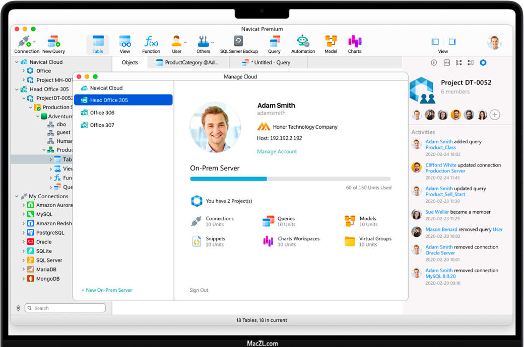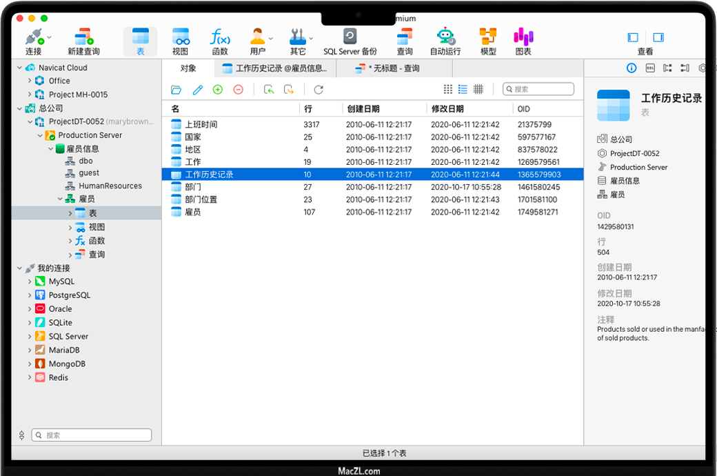 Navicat Premium for Mac 是一款数据库开发工具,可让您从单个应用程序同时连接到 MySQL、MariaDB、MongoDB、SQL Server、Oracle、PostgreSQL 和 SQLite 数据库。与 Amazon RDS、Amazon Aurora、Amazon Redshift、Microsoft Azure、Oracle Cloud、Google Cloud 和 MongoDB Atlas 等云数据库兼容。您可以快速轻松地构建、管理和维护您的数据库。