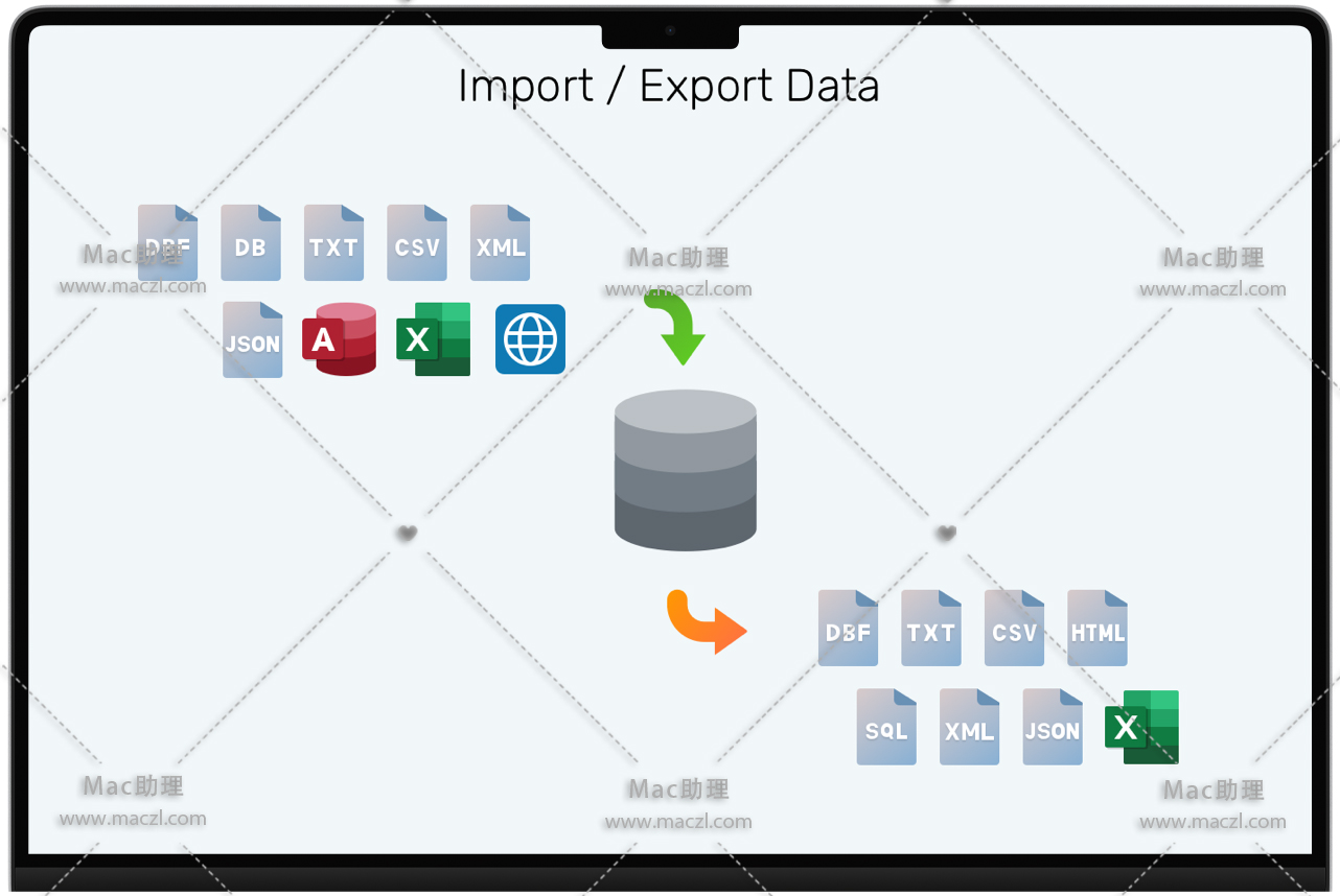 从各种格式或通过 ODBC 连接将数据导入数据库,前提是已设置数据源连接。从表、集合、视图或查询结果中无缝导出数据到流行格式,如 Excel、Access、CSV 等。