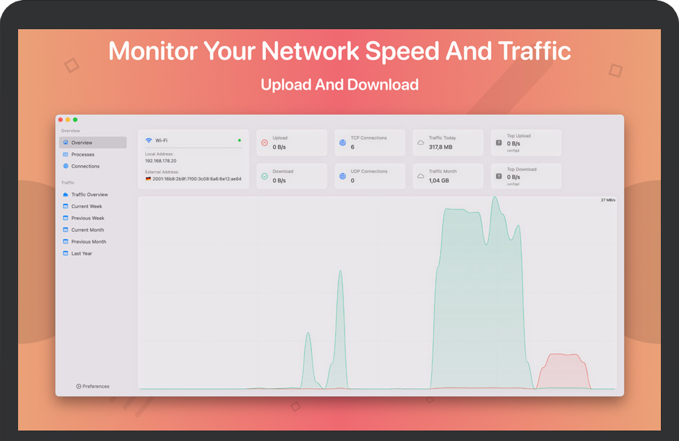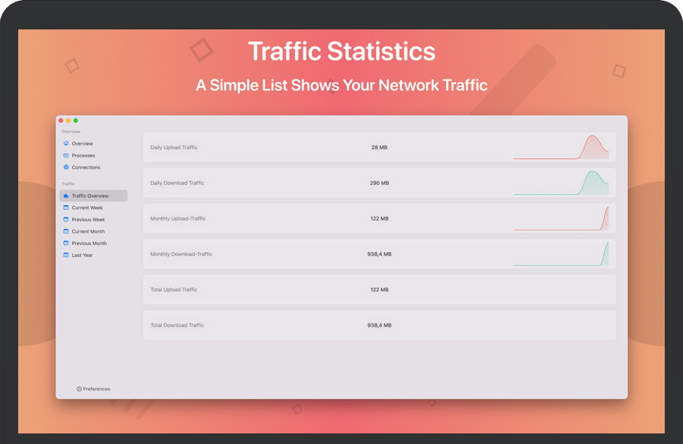 NetWorker Pro for Mac 是一款在macOS系统菜单栏中方便地显示实时网速信息应用。NetWorker Pro还有一个控制面板,可以通过图表的形式显示传入和传出的数据,可以查看网络连接端口数量以及IP地址和协议,可以按总量/本周/上周/本月/上月等方式查看网络流量。还提供了菜单栏流量显示样式自定义功能。