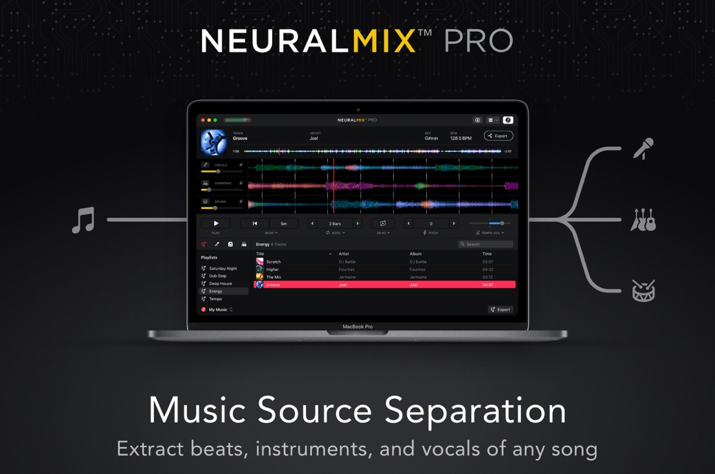无论您是专业人士、练习音乐家还是音乐爱好者,Neural Mix™Pro都可以将歌曲解构为原始组件,为您的创作工作流程提供独特的工具。