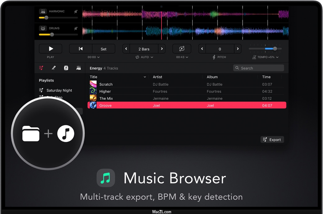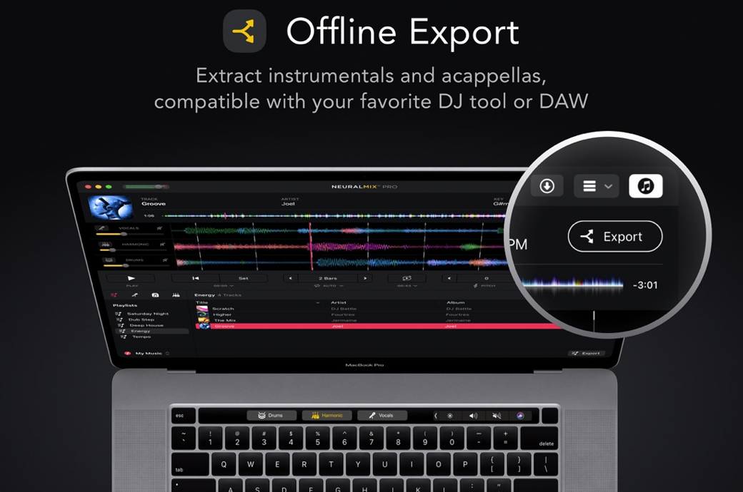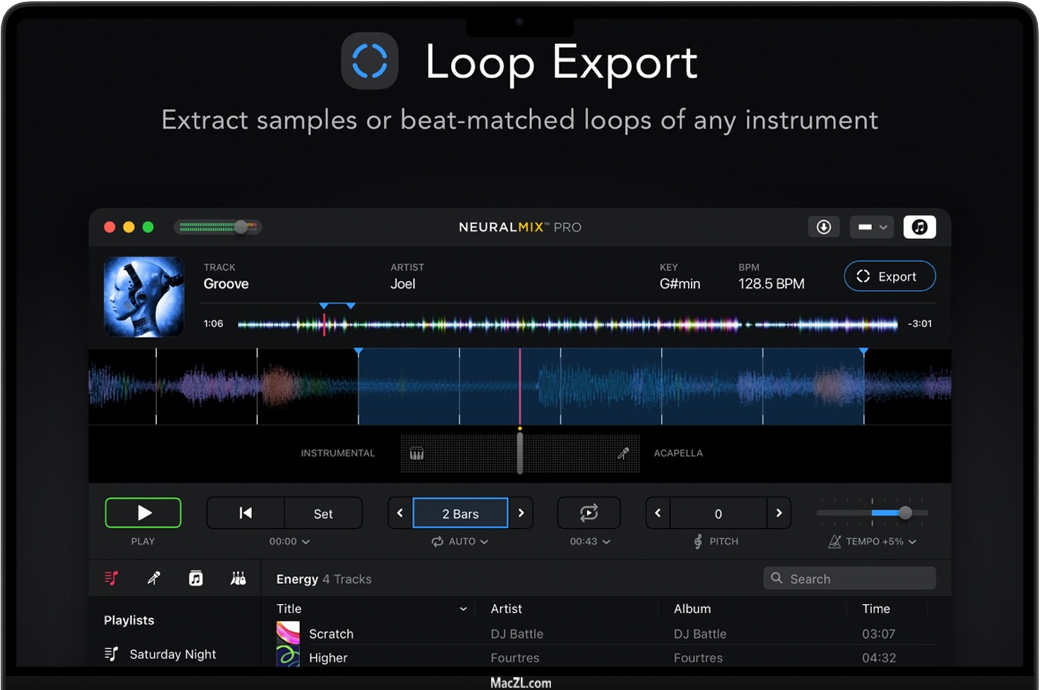您可以创建节拍精确的循环,改变节奏,并转置歌曲的关键,同时实时删除人声、打击乐或和声部分。高级离线导出允许您自动提取无伴奏合唱和乐器,以用于您最喜欢的DJ或音乐制作软件。