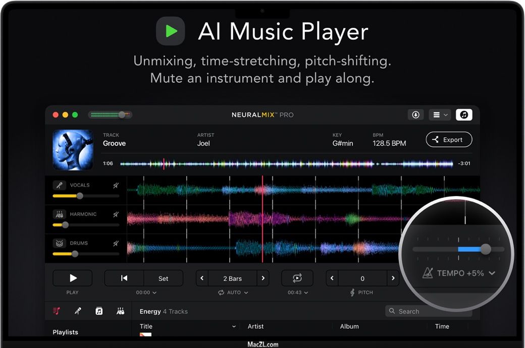 Neural Mix Pro for Mac 是一款面向制作人、DJ和音乐家的人工智能音乐播放器和编辑器。Neural Mix™Pro由多次获得苹果设计奖的Algoriddin创建,提供了一个直观的界面,可以隔离任何歌曲的节拍、乐器和人声。您可以创建精确的节拍循环,更改速度和移调歌曲的键,同时实时删除人声,打击乐或和声部分。先进的离线导出功能使您可以自动提取acappellas和乐器,以在您喜欢的DJ或音乐制作软件中使用。