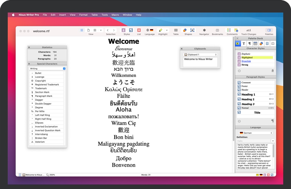 Nisus Writer Pro 提供直观的界面、卓越的多语言文本支持、便捷的兼容性和丰富的工具,让您能够高效地撰写、编辑和润色文章。无论是课堂笔记、学术论文,还是书籍写作,Nisus Writer Pro 都能轻松胜任。